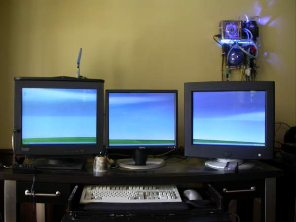The final Presentation. Triple monitors driven by a matrox P750 graphics card. The CDROM, burner, second hard drive, card reader, and other periferals that would normally be in the case are off to the side