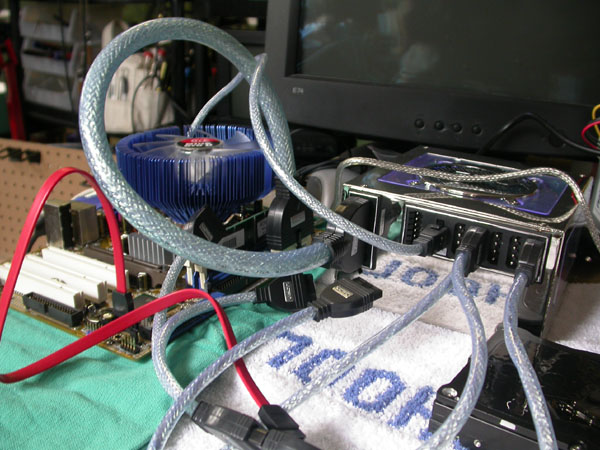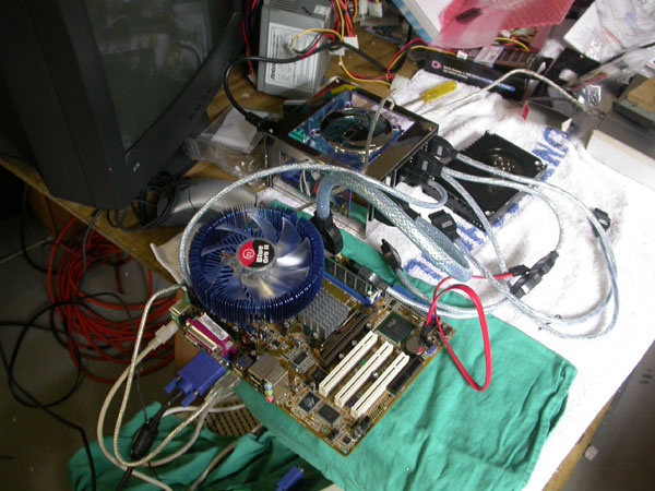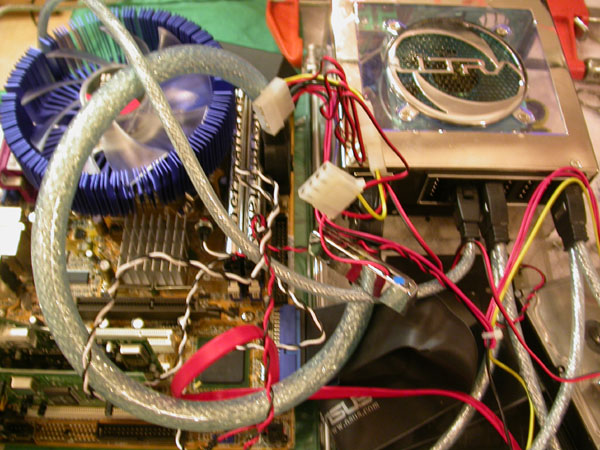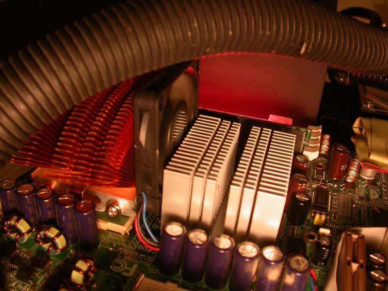 I put the only fan between the CPU and the chipset heatsink to minimize noise. See the little guy squeezed in there. Now that is efficiency.