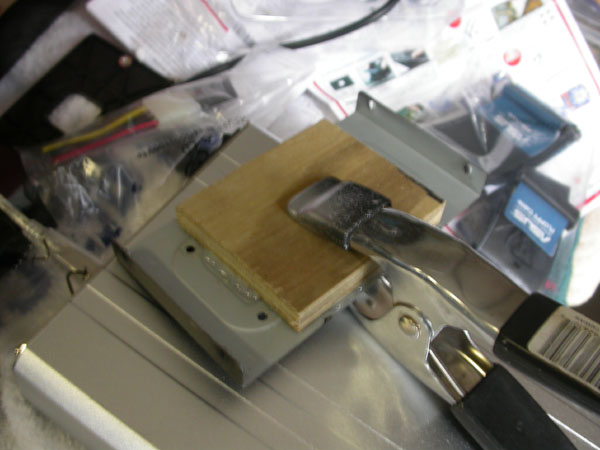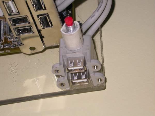 On the lower right is the on switch. It sits atop two USB ports I added in. I also added one USB/firewire card and another PCI usb card. Need alot of expansion capability since all the expansion takes place away from the wall hanging PC.
