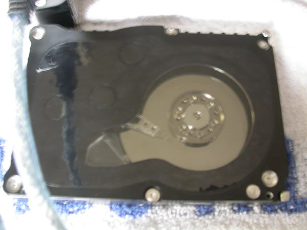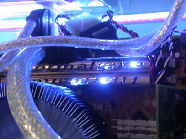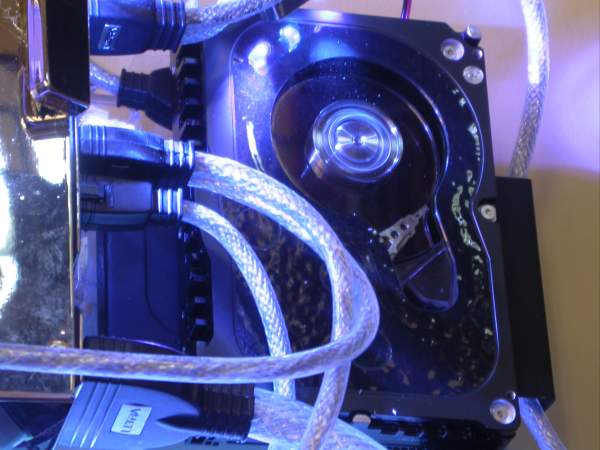 This it the heart of the machine: the Western Digital Raptor X. 10,000 rpms of visible spinning platters. I have highlighted it with LEDs so you can see the read/write head move even in the dark. This drive was actually my inspiration for the whole exposed pc idea.