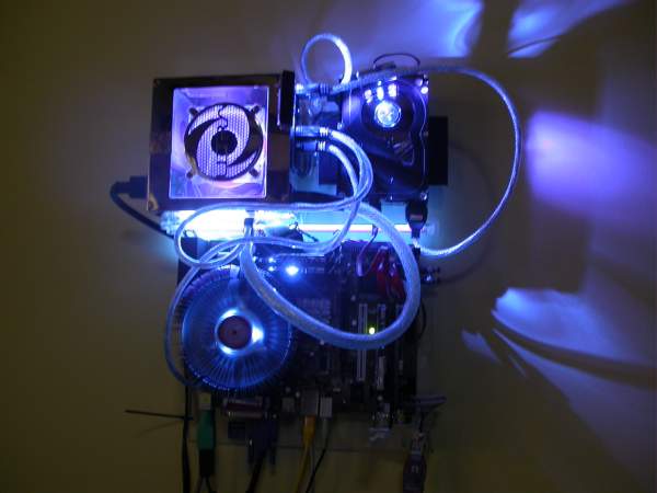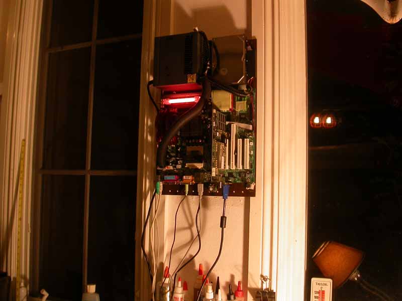 ...This concept came about when my monster dual CPU machine broke and it took forever to disassemble just to fix it. I figured an open-architecture PC would be much easier to maintain in the future. This rig has a lot of USB ports since much of the hardware such as the CD drives are external, and on my desk. This way it is easy to swap parts in and out of the PC. I could have even put the power supply on the desk, but there I ran into power-cable length limitations. I left the primary hard drive on the wall since it looked cool spinning up there.